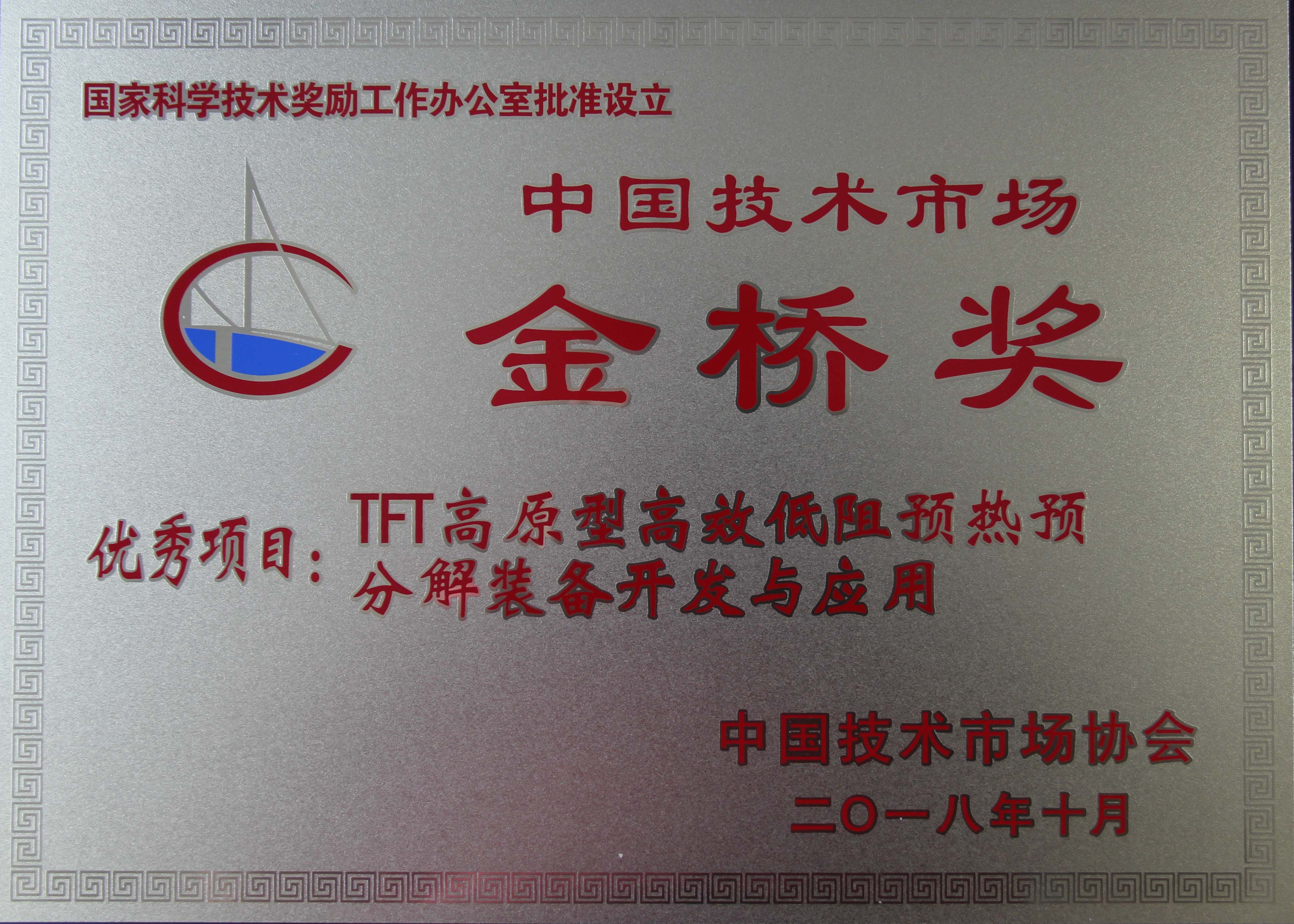 第九屆中國(guó)技術(shù)市場(chǎng)協(xié)會(huì)金橋獎(jiǎng)?lì)C獎(jiǎng)大會(huì)于2018年10月31日在北京召開,我公司繼上屆榮獲先進(jìn)集體獎(jiǎng)后,今年申報(bào)的“TFT高原型高效低阻預(yù)熱預(yù)分解裝備開發(fā)與應(yīng)用”項(xiàng)目經(jīng)第九屆中國(guó)技術(shù)市場(chǎng)協(xié)會(huì)金橋獎(jiǎng)評(píng)審委員會(huì)評(píng)審,榮獲優(yōu)秀項(xiàng)目獎(jiǎng)。