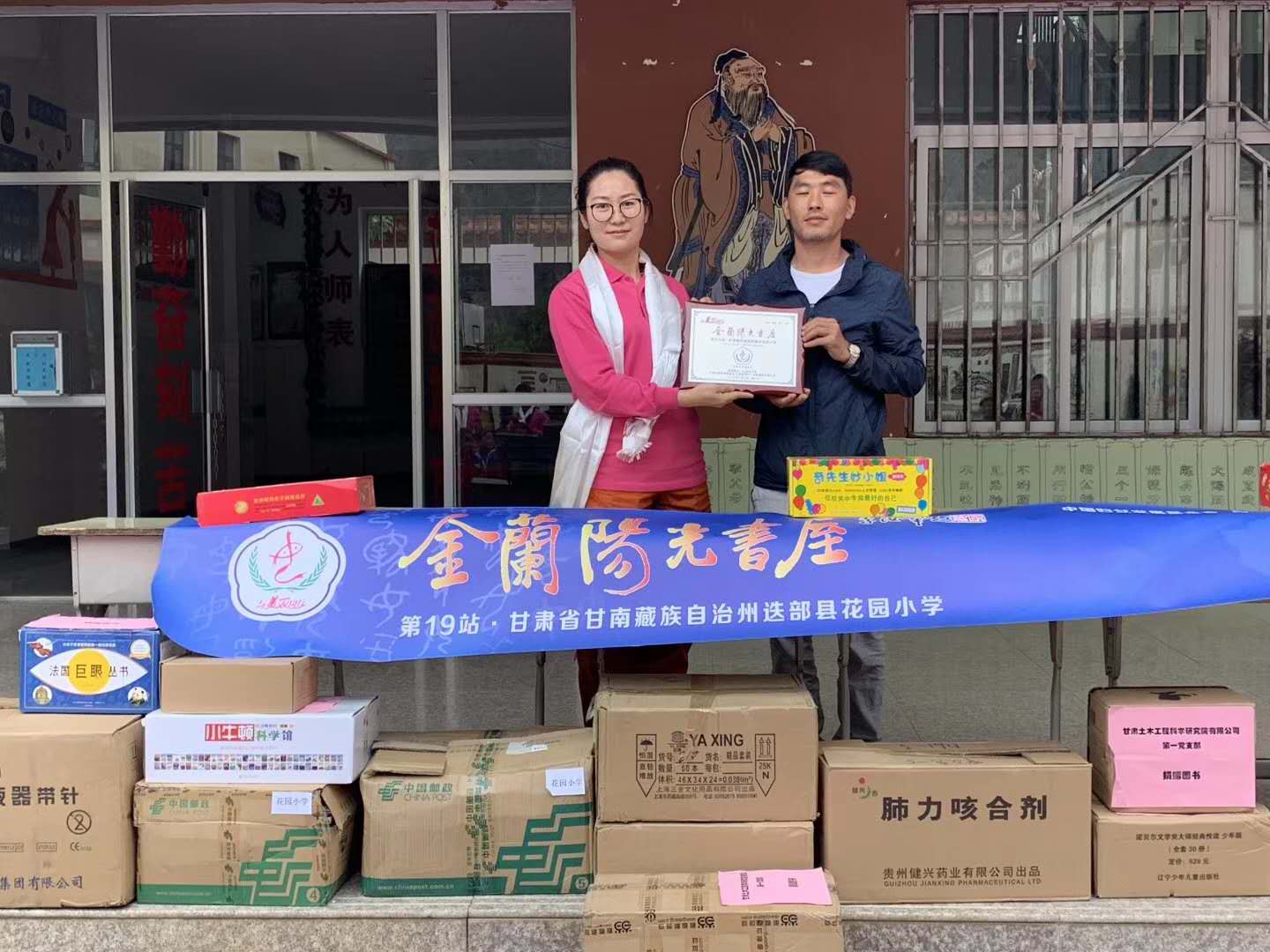 2019年6月8日甘肅省腫瘤醫(yī)院義診團(tuán)將圖書(shū)捐贈(zèng)給迭部縣旺藏鎮(zhèn)花園小學(xué),建成了第19個(gè)金蘭陽(yáng)光書(shū)屋。